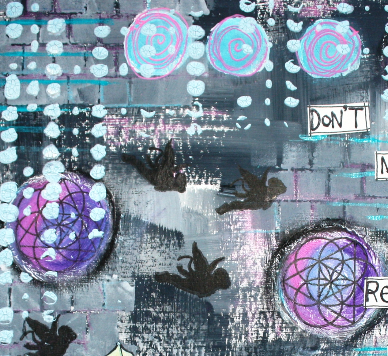 On the finished page I have now actually filled in the stamped swirl with gesso as I wanted to stamp the small image from the Visometry Set 3 on my background as I thought it would go well with my image. I just added gesso over the swirl, filled it in with colour and then stamped my image over it, easy peasy.